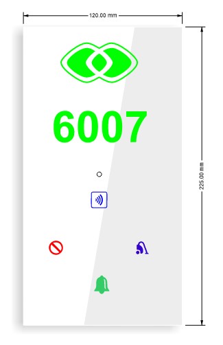 FDH-6MCPV | 90mmX225mm | 85 - 230V AC 50/60Hz | 2W | Glass Panel + Poly carbonate body | Wired/wireless | dry contact, RS485 or WiFi | Hotel Room | Blue, green, red, white, orange Logo, | Room Number, all Icons and Led color |